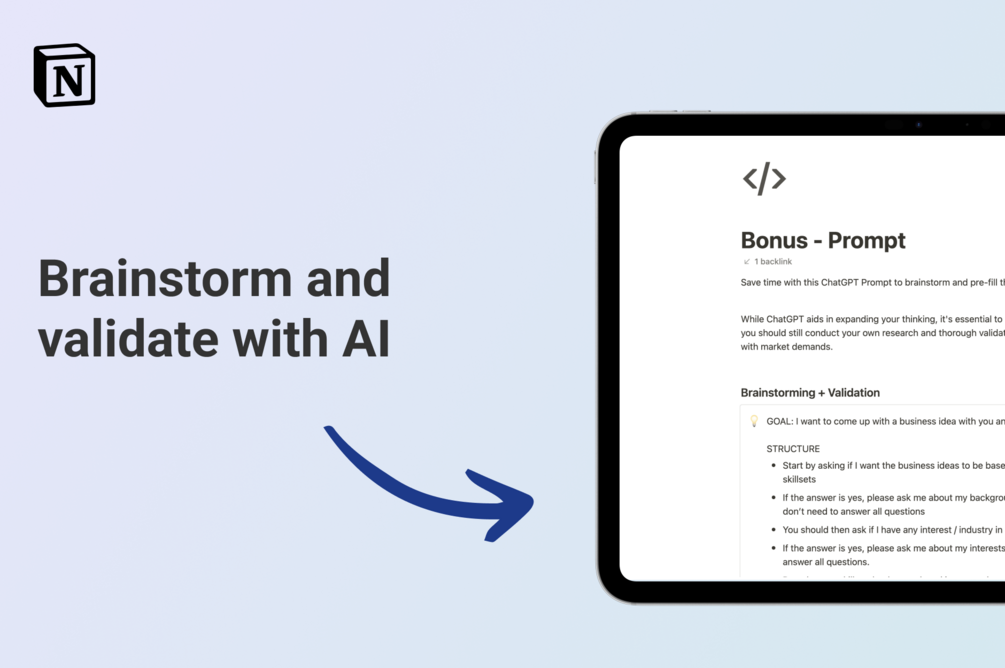 Automate with AI: the Toolkit includes a bespoke ChatGPT prompt to brainstorm ideas based on your background and interests, and streamline your idea validation process and focus on what truly matters.
